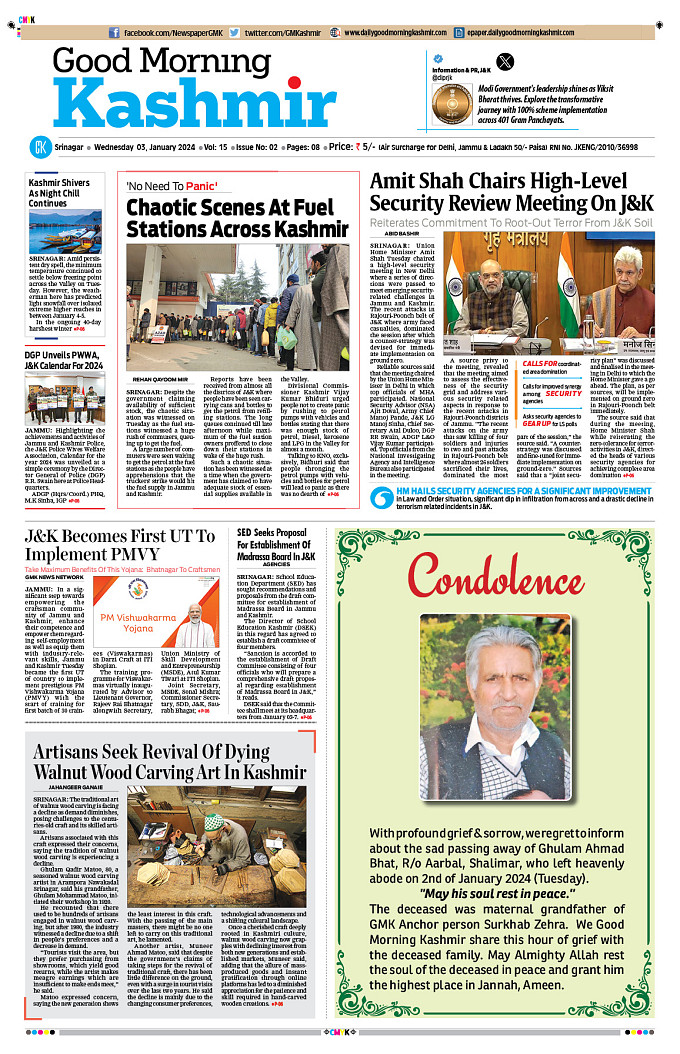GMK, January, 03 2024 Good Morning Kashmir Page 1Page 2Page 3Page 4Page 5Page 6Page 7Page 8 × GMK, January, 03 2024 Full PDF << First << 1 2 3 4 >> Last >> 12345678