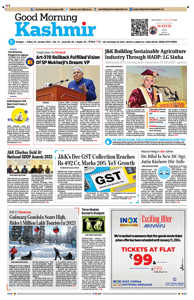 GMK, January, 05 2024 Good Morning Kashmir Page 1Page 2Page 3Page 4Page 5Page 6Page 7Page 8 × GMK, January, 05 2024 Full PDF << First << 1 2 3 4 >> Last >> 12345678