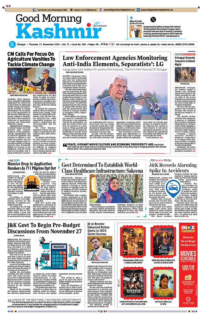 GMK, Nov, 21 2024 Good Morning Kashmir Page 1Page 2Page 3Page 4Page 5Page 6Page 7Page 8 × GMK, Nov, 21 2024 Full PDF << First << 1 2 3 4 >> Last >> 12345678